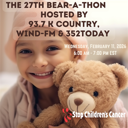 This inspiring event invites listeners and readers of 93.7 K-Country, 92.5/95.5 Wind-FM & 352today to go online or call to pledge money ($40) toward donating a Bear or a Chemo Duck for the children in treatment at UF Health Shands Children's Hospital. These bears are also given to the siblings to support them. For more information, go to https://stopchildrenscancer.app.neoncrm.com/campaigns/26bat or call the Stop Children's Cancer office at 352-377-2622.