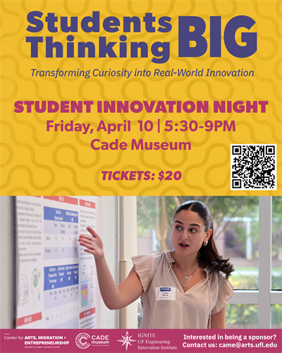 Students Thinking BIG brings together student projects across the arts, humanities, science, engineering, technology, and business, creating a community-facing space that connects students, educators, families, and community members within Gainesville’s innovation ecosystem. hosted in partnership with the UF Engineering Innovation Institute’s IGNITE (Innovation Gator Network), the UF Center for Arts, Migration, and Entrepreneurship (CAME), and the Cade Museum for Creativity & Invention.